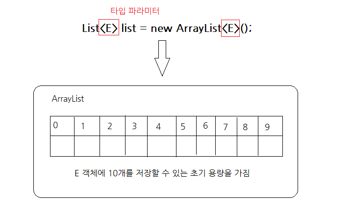 모든 종류의 객체를 저장할 수 있다는 장점은 있지만, 저장할 때 Object로 변환하고, 찾아올 때 원래 타입으로 변환해야 하므로 실행 성능에 좋지 않은 영향을 미친다. 일반적으로 컬렉션에는 단일 종류의 객체들만 저장된다. 그래서 자바 5부터 제네릭을 도입하여 ArrayList 객체를 생성할 때 타입 파라미터로 저장할 객체의 타입을 지정함으로써 불필요한 타입 변환을 하지 않도록 했다. 이후에 소개되는 모든 컬렉션 객체들도 마찬가지 이유로 타입 파라미터를 이용해서 저장할 객체의 타입을 지정할 수 있다. 다음 코드는 자바 4 이전과 자바 5 이후의 차이점을 잘 보여준다.